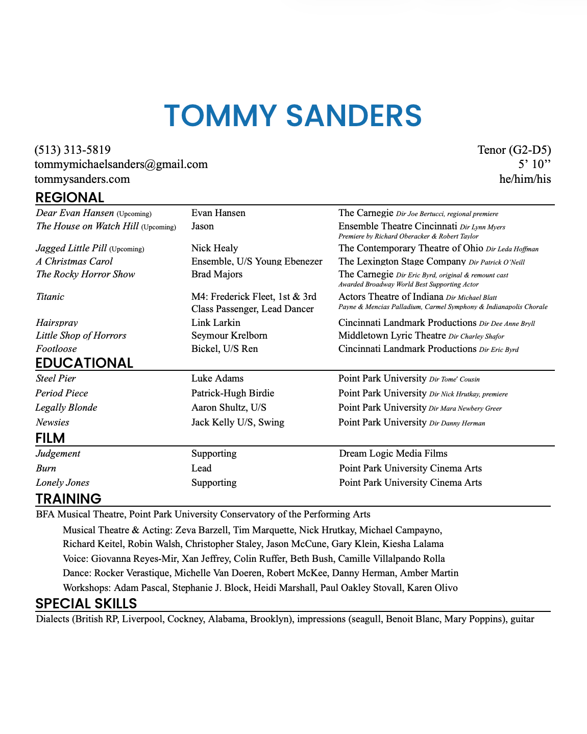 Iβm an actor from & currently based in Cincinnati, OH. I recently graduated with my BFA in musical theatre from Point Park Universityβs Conservatory of Performing Arts. Credits: Dear Evan Hansen (Evan, upcoming), The Rocky Horror Show (Brad Majors, Best Supporting Actor BroadwayWorld, starring Dusty Ray Bottoms of βRu Paulβs Drag Race) at The Carnegie, The House on Watch Hill (Jason, upcoming) a new musical by Richard Oberacker at Ensemble Theatre Cincinnati, Titanic (M4: Fleet) at ATI with the Carmel Symphony, A Christmas Carol (Ensemble, Young Ebenezer U/S) at The Lex, Hairspray (Link Larkin), Footloose (Bickle) at CLP.